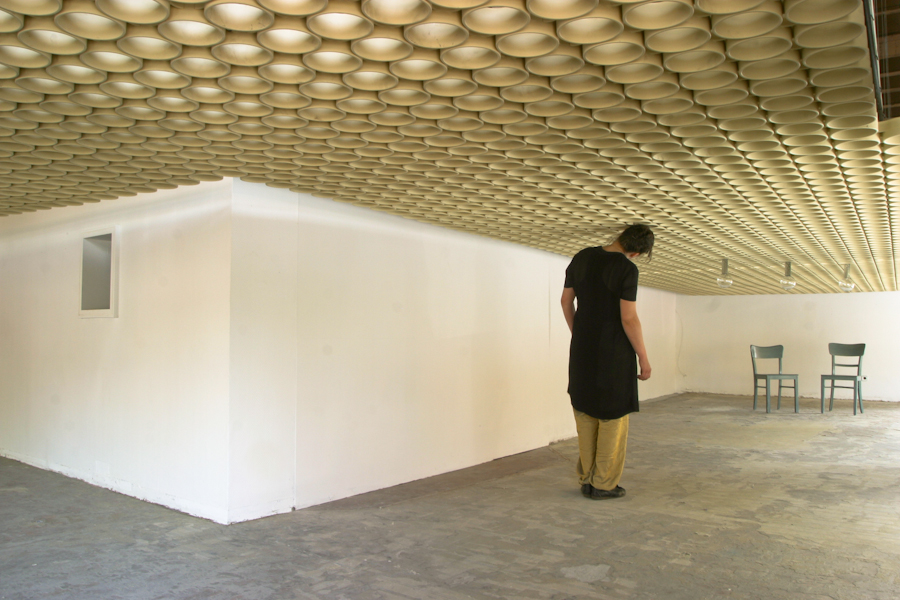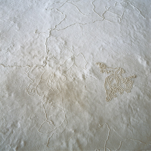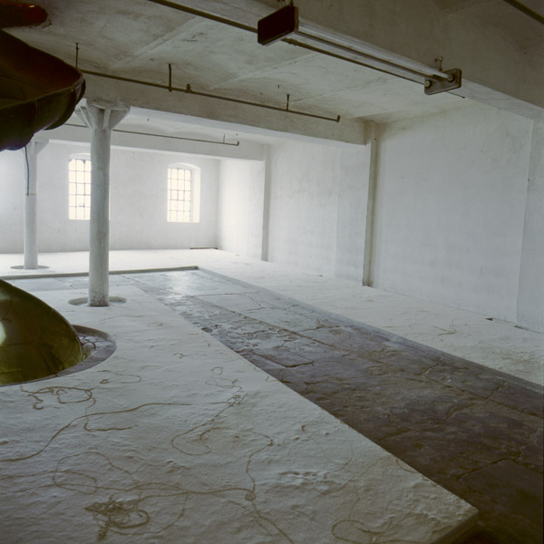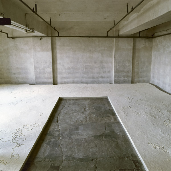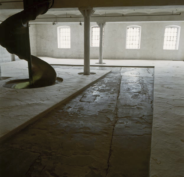Ein Raum des ehemaligen Lagers der Mühle. Vom Boden etwas erhöht zieht sich eine Plattform mit Mehl bedeckt, den Wänden folgend, durch den ganzen Raum. Dem Besucher bleibt ein Weg zum Begehen. Die Mehlfläche ist durchsetzt von Spuren, die man im ganzen Gebäude im niedergeschlagenen Mehlstaub finden konnte. Diese Zeugen von Bewegung nach Einstellung der Arbeit in der Mühle, bekommen hier einen künstlichen Lebensrahmen. Ein „Garten“, angelegt in einem Raum, dessen Nutzung der Vergangenheit angehört.