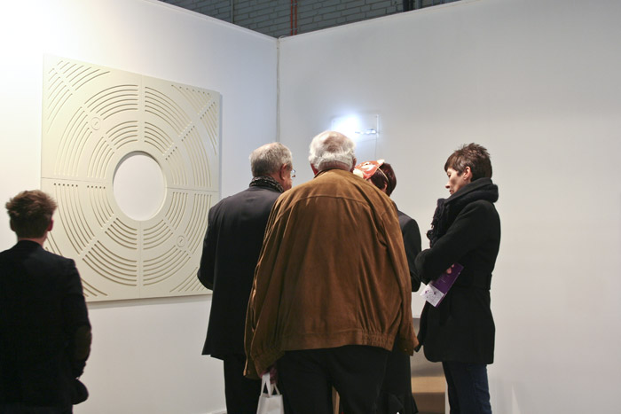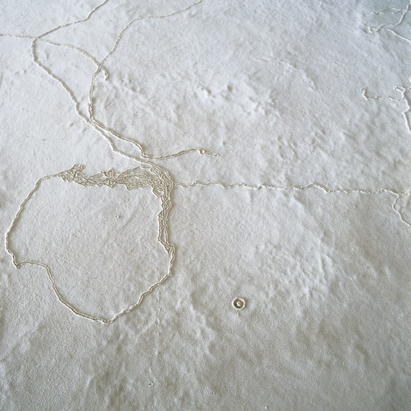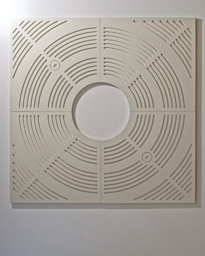 Die op-artige Flachware mit Reliefstruktur erweist sich, unter Einbeziehung des Titels (schlicht „Baumscheibe“), als ein post-minimales Artefakt. Nicht referenzlos sondern einen Gott der kleinen Dinge rühmend, ist dieses Objekt ein Produkt der Zähmung von Natur im städtischen Kontext und nimmt Bezug auf unser Umfeld - ob Stadtgefüge, Architektur oder Inneraum - das sich übervoll mit funktionalen Design-Klassikern und anthrozentrischer Machtdemonstration präsentiert. „Baumscheibe“ passt sich formschöner jeder Wand eines White Cube an, ohne seine Herkunft vergessen zu lassen. J. Kurz