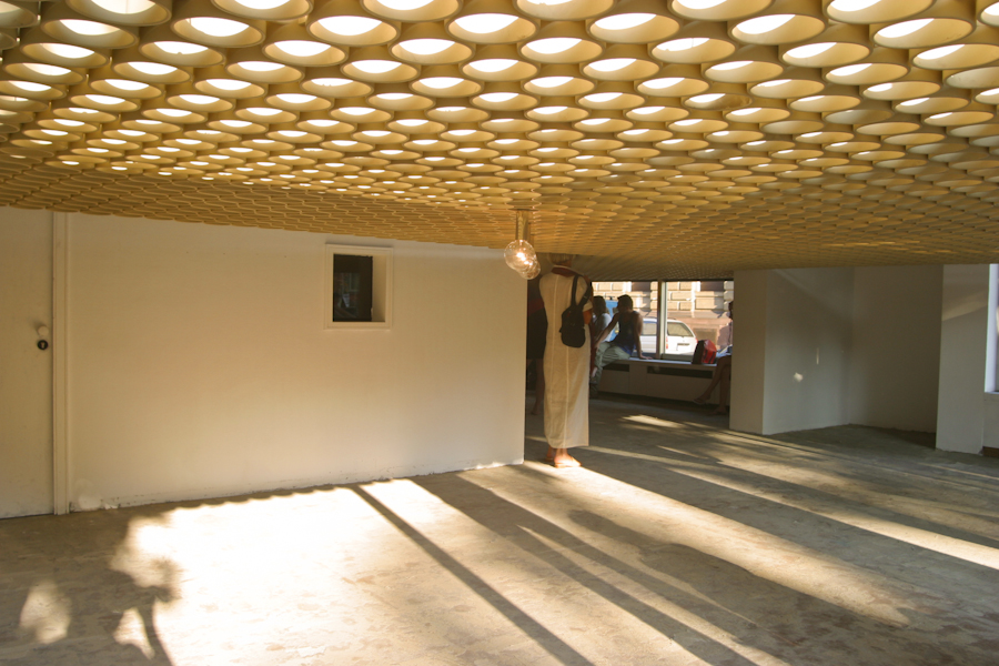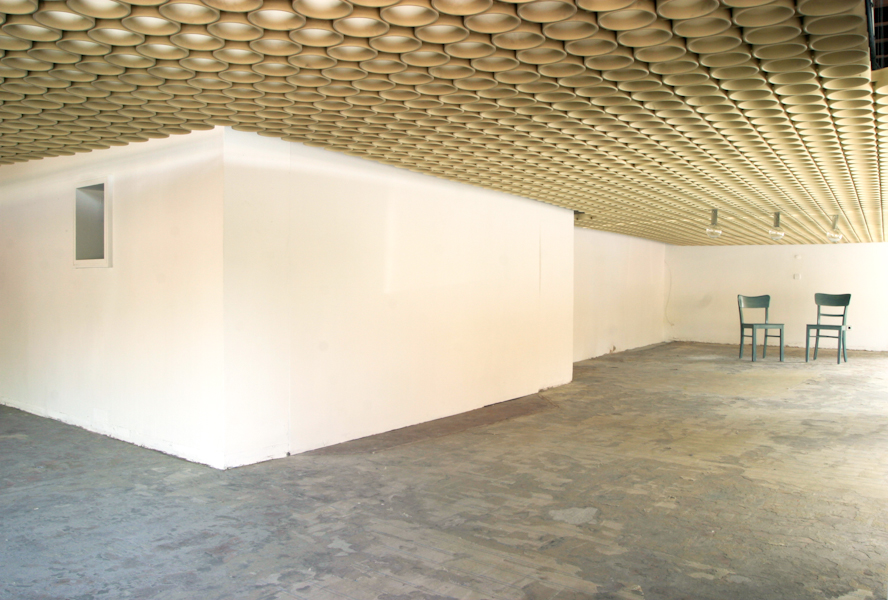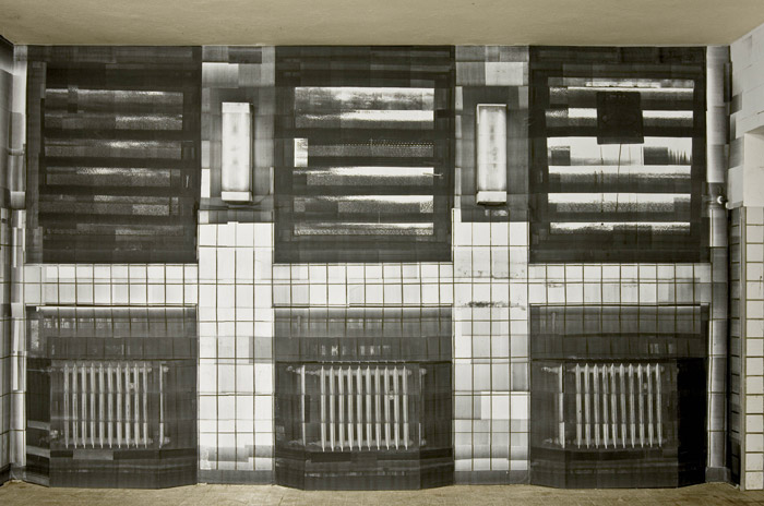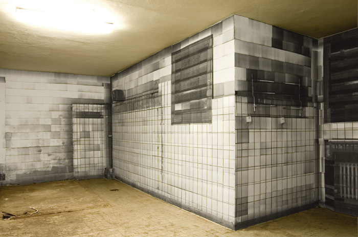 Vor Ort in einer ehemaligen Backstube, einem unsichtbareren Teil der Hildesheimer Infrastruktur scannt Lars Bergmann den Raum mit einem handelsüblichen Flachbrettscanner Stück für Stück ab, speichert die so gewonnenen Bilddaten auf der Festplatte seines Computers, druckt diese als Din-A4-Bild wieder aus und tapeziert das Blatt an die „richtige“ Stelle des Raums. Bergmann tastet, bzw. saugt so den Raum förmlich ab. (…) Der vorhandene Raum wird so zugeklebt mit einem Bild seiner selbst. Wandhaken verschwinden und tauchen als zweidimensionales Nachbild wieder auf, diffuse Spinnweben bekommen eine feste Form und Fenster verlieren ihre Funktion. (…) Bergmanns „Bild“ funktioniert wie ein nach außen gekehrter Spiegel. Die Wände sind hier keine schiere Notwendigkeit, die Wände sind Motiv und Notwendigkeit. Reflexion bei gleichzeitiger Absorption. Alexander Hentschel, Auszug aus dem Katalogtext, Raumsaugerfestival, Hildesheim 2007