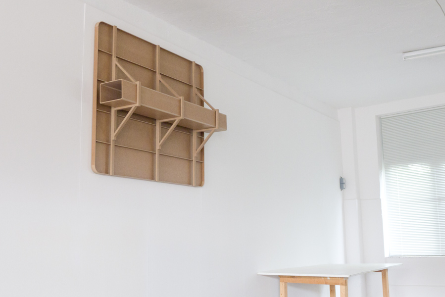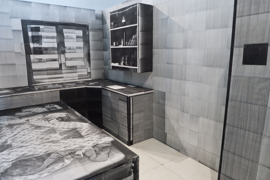 Das Objekt im Raum entpuppt sich nach dem Betreten als Raum selbst, als Kopie eines Raumes, in dem jemand lebt. Ein Bett, Tisch, Schrank, Regal, ein Computer, das Fenster, Bücher, Fotos und Briefe… Die Möbel stülpen sich in den Raum, sind nur noch Fläche, Abbild und Form. Die Dreidimensionalität des Raums wurde Stück für Stück übersetzt in das binäre System von Nullen und Einsen, eine digitalisierte Potenz, um nun als Ausdrucke, entzeitlicht und entörtlicht, etwas Neues aufzumachen. Umgeben vom Bildträger des Objektes findet man autonome Dinge, die der physikalischen Wirklichkeit perfekt entrückt, nicht Teil dieser Welt sind. Und dennoch gaukelt diese Kopie Leben vor, weckt Voyeurismus und veranlasst das Bild einer Tür (mit Haken und Jacke) zu schließen, um allein in diesem Raum zu sein, in welchem nichts altert, sich nichts berühren noch bewegen lässt, noch von der Seite betrachtet werden kann. J. Kurz