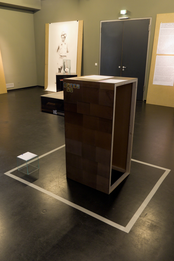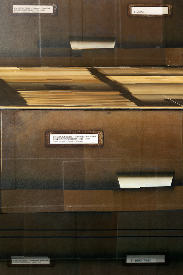 Mit der für The Subjective Object entwickelten Arbeit „Archivschrank“ setzt Lars Bergmann seine Scan- Serie fort, in der er mit einem handelsüblichen Flachbettscanner Objekte und Räume kopiert und in einem neuen, so für das Original nicht erreichbaren, Kontext zeigt. Das für die Ausstellung entstandene Objekt ist eine „Kopie“ des Archivschranks, der im Dresdner Fotografie-Archiv der Staatlichen Kunstsammlungen Dresden den bis heute nur ansatzweise bearbeiteten fotografischen Nachlass des physischen Anthroplogen und Kolonialreisenden Egon von Eickstedts beherbergt und damit auch das Bildmaterial, welches auf seiner Indienexpeditionen in den Jahren 1926 – 1929 entstand. Im Kontext des Archivs als zugangsbeschränktem Raum, dessen Deutung ausschließlich durch einige wenige erfolgt, die hierauf Zugriff haben, archiviert Bergmann minutiös das auratische Moment des Bilderkonvoluts in seiner räumlich unspektakulärsten Form – der des Schranks. Einblick wird nur bedingt gewährt, wenige Details verweisen auf mögliche Zusammenhänge, die – ähnlich wie bei der Bearbeitung archivierter Materialien – in die Rezeption einbezogen oder ausgeklammert werden können. Damit stellt das Objekt einerseits die Frage nach Zugänglichkeit, andererseits auch die nach der Organisation des Archivs und einer spezifischen Wissensproduktion: Welches Wissen wird wie und durch wen hergestellt? Die künstlerische Praxis Bergmanns, den Archivschrank mit einem Scanner abzutasten, kann gleichsam als kritische Haltung dem einer kolonialen Praxis entstammenden fotografischen Material gegenüber als auch als ein Sich-Herantasten an Fragen nach dem Umgang mit kolonialistischen Archiven aus postkolonialer Perspektive. J. Kurz